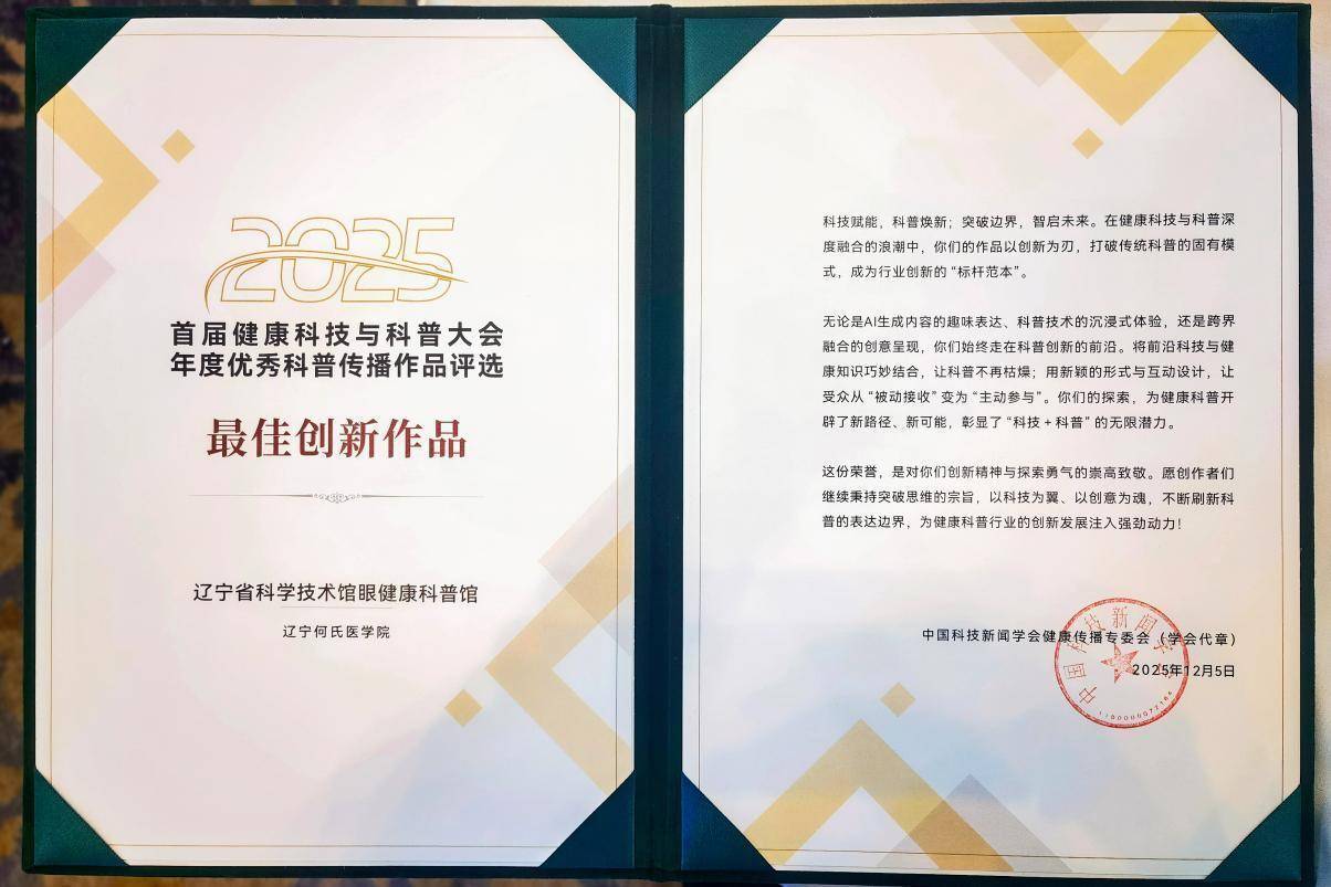 大会期间,“2025年度优秀科普传播人物及作品案例”盛大发布。本次评选面向全国医疗机构、健康科技企业、科研院所、社会组织及广大科普从业者广泛征集大量优秀实践,最终评选出“年度优秀科普传播人物”与“年度优秀科普传播作品”两大类别奖项,共50位获奖者及作品脱颖而出。其中,辽宁何氏医学院参评的辽宁省科学技术馆眼健康科普馆项目荣膺最佳创新作品奖项。