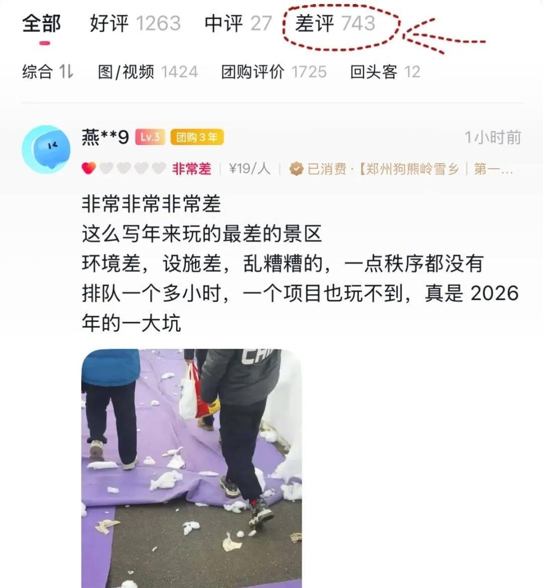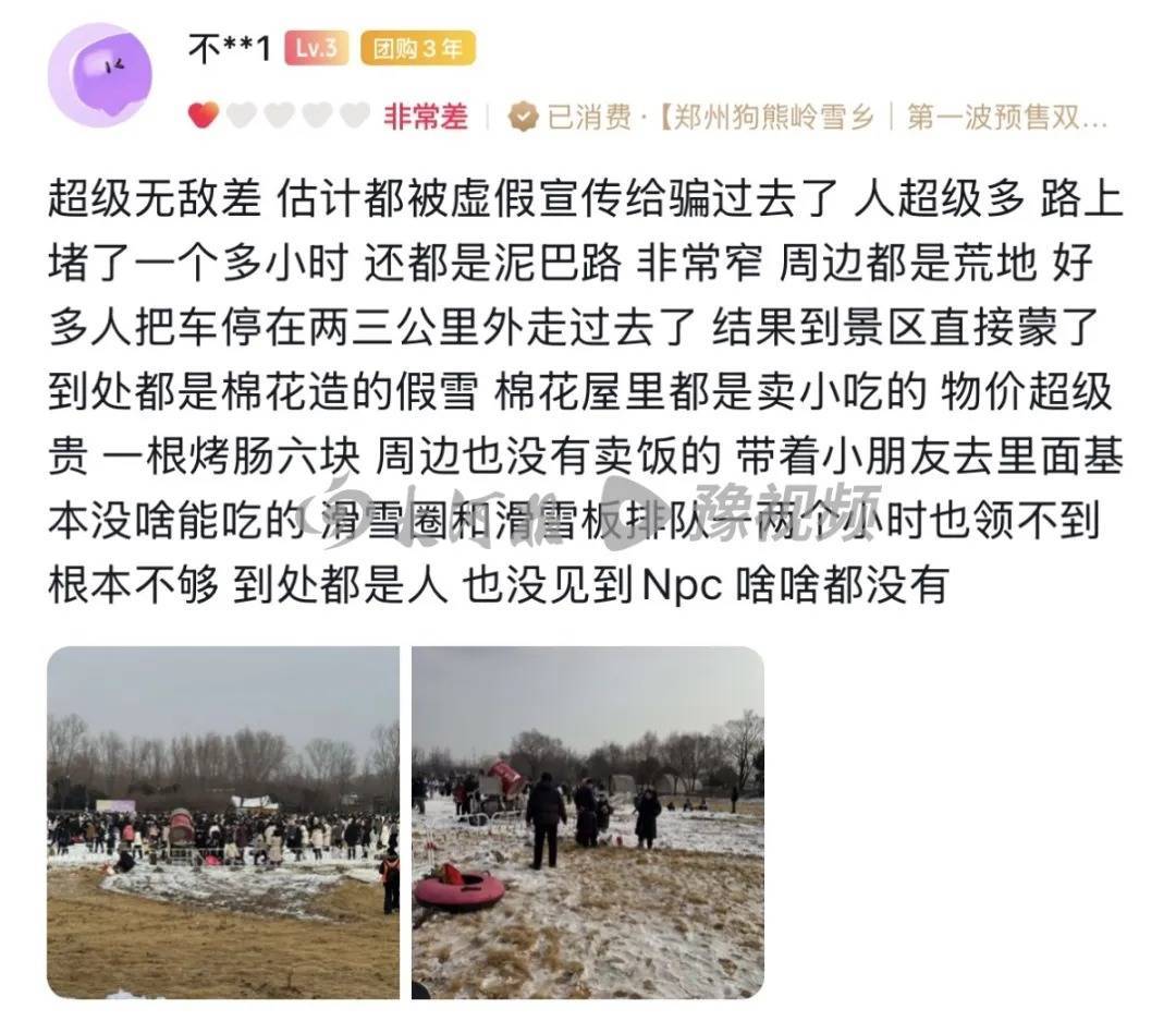 近日,郑州一处自称“梦幻雪乡”的新晋打卡地,上演了一出现实版“开门黑”:开业仅三天,就在抖音购票平台狂揽超过700条差评,被游客集体吐槽“用棉花造雪虚假宣传”“人太多了,接纳不了这么多游客,为何还让进?”“物价高”“卫生脏乱差”……