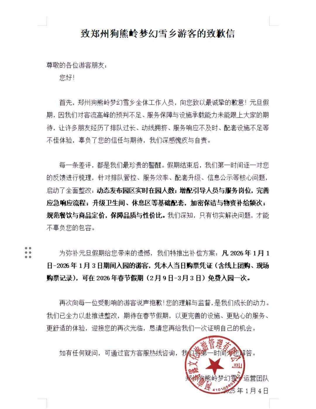 1月5日下午,“郑州狗熊岭梦幻雪乡”官方号发布致歉信,承认在“排队管控、服务效率、配套升级、信息公示”等方面存在问题,并表示已启动全面整改,包括动态发布实时人数、增配服务人员、升级配套设施、规范商品定价等。