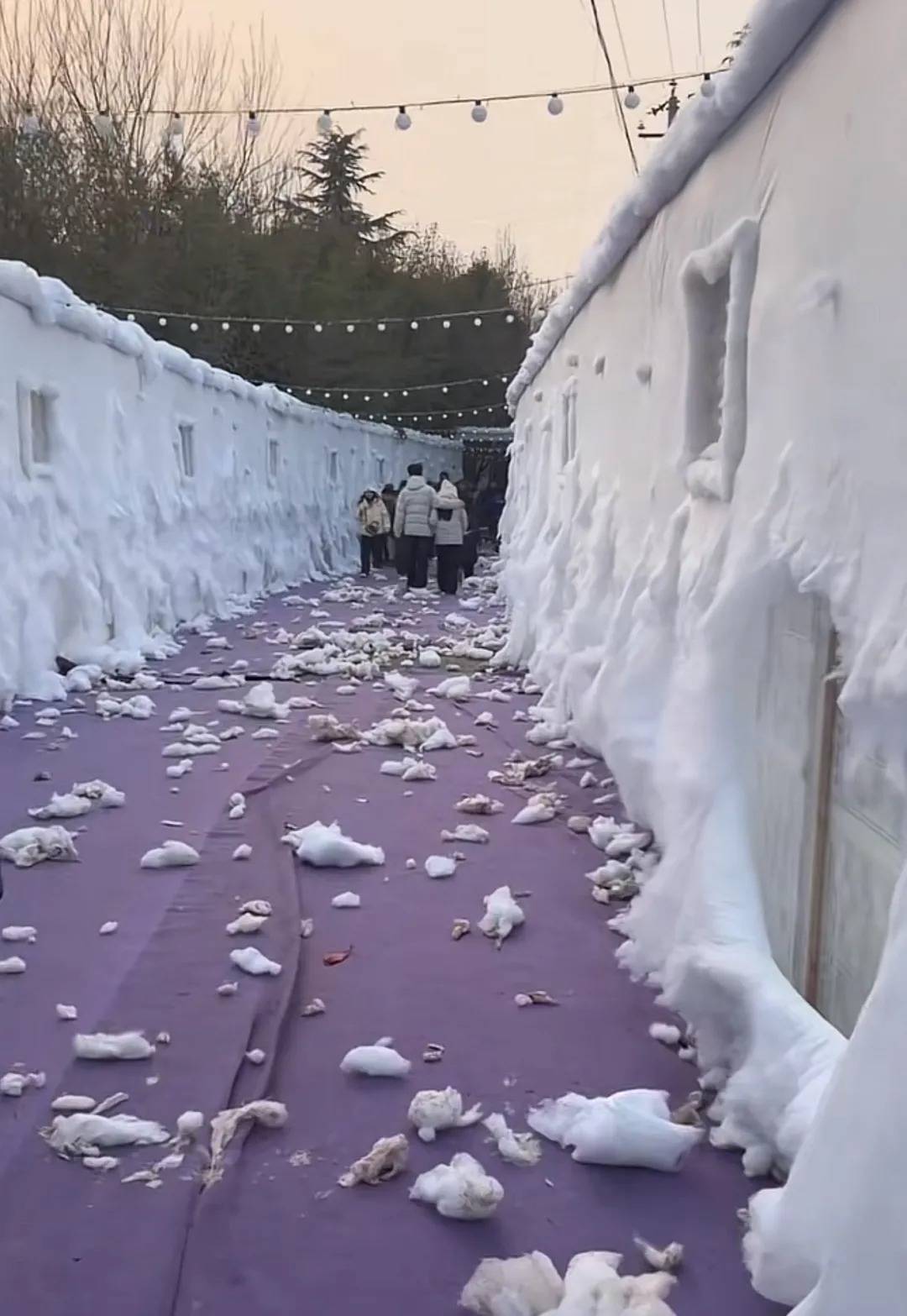 游客称景区宣传中厚厚的“积雪”,实际为白色丝绵仿制;宣传图里童话般的雪屋雪景,现场看却略显粗糙。此外,卫生状况不佳、排队混乱、物价偏高(如一根烤肠售价6元)等问题也成为差评焦点。