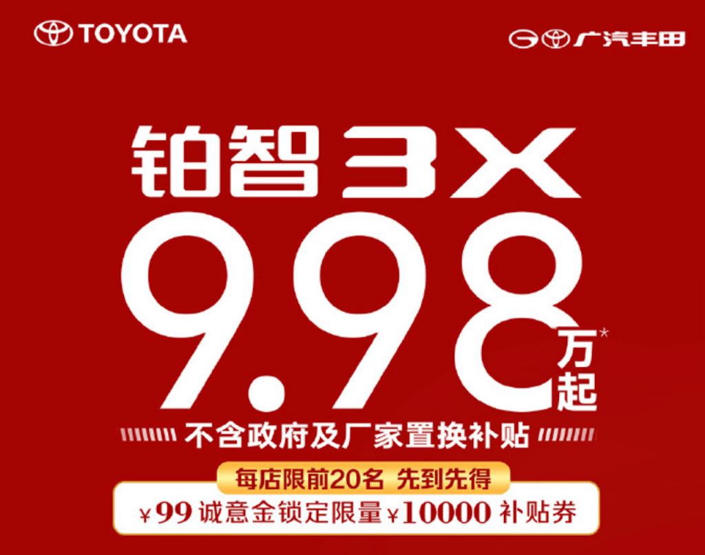 广汽本田与广汽丰田也紧随其后。广汽丰田旗下的铂智 3X 宣布直降 1 万元并辅以购置税补贴。