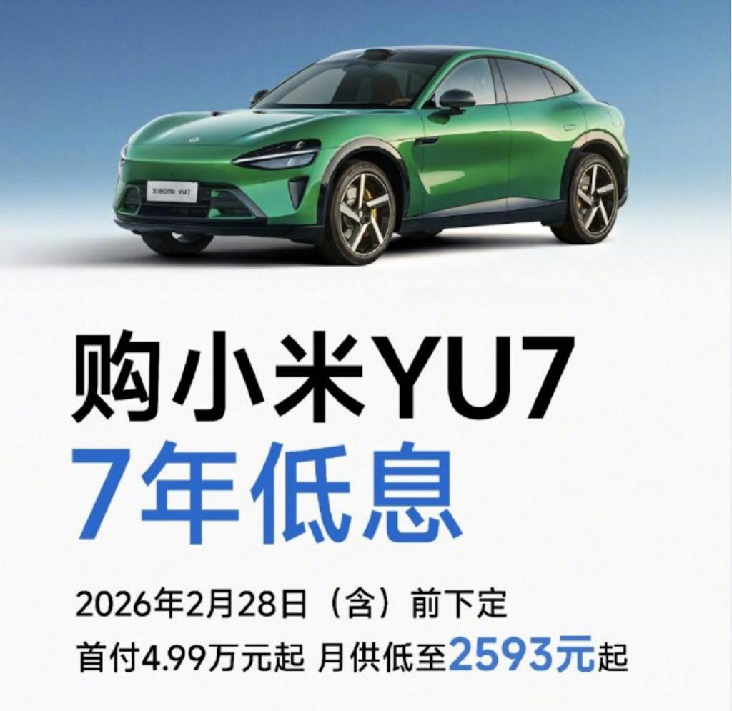 和特斯拉政策类似,小米 YU7 也跟进了 7 年低息的政策,同时还发布了 3 年免息和购置税减免二选一的政策。