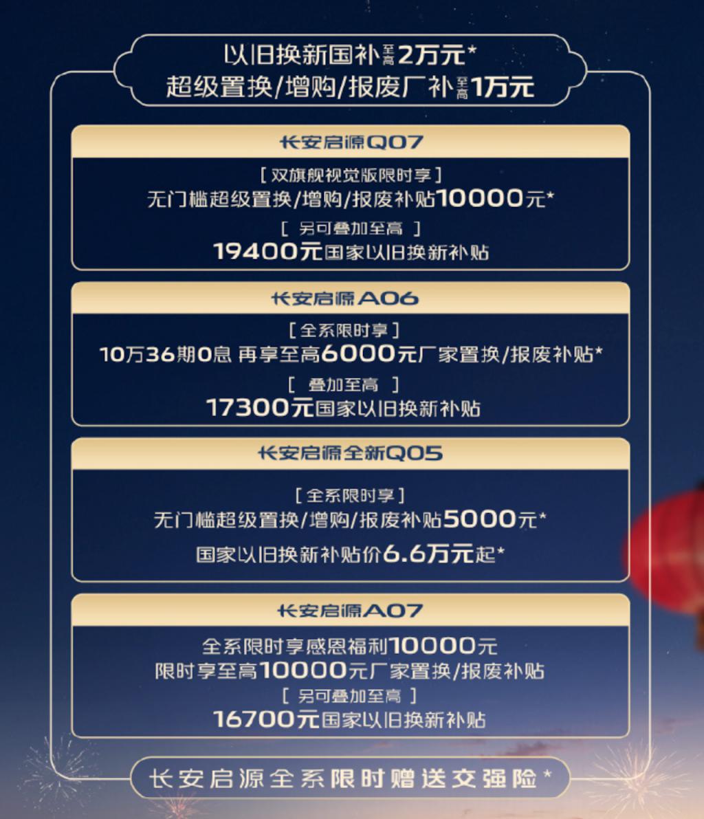 长安启源在本次价格战中则采取了极其细致的梯度补贴策略。针对主力轿车 A06、A07,不仅提供厂家直接现金补贴,更创新性地加赠了交强险,有效降低了消费者的首付和落地成本。