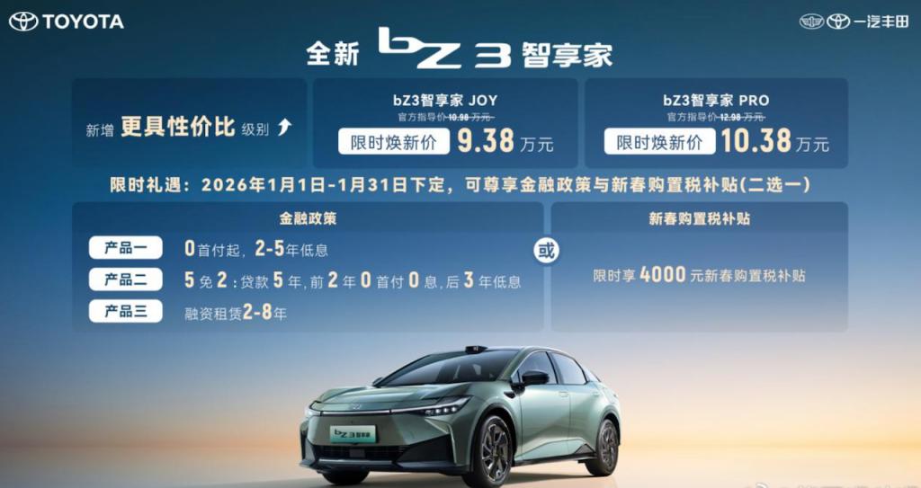 此外,另一款车型 bZ5 也给出了 4000 元的购置税补贴,显示出丰田在纯电赛道上“清仓式”反击的决心。