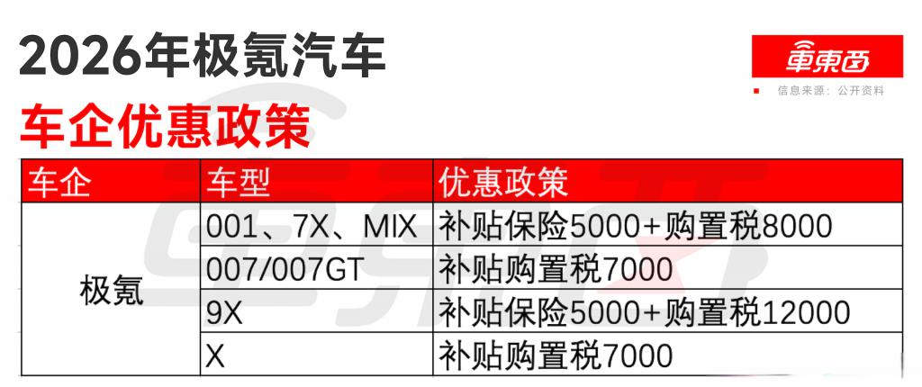 极氪 001、7X、MIX 等核心车型提供“ 5000 元保险补贴 +8000 元购置税补贴”。顶级车型极氪 9X 的补贴总额更是高达 1.7 万元。
