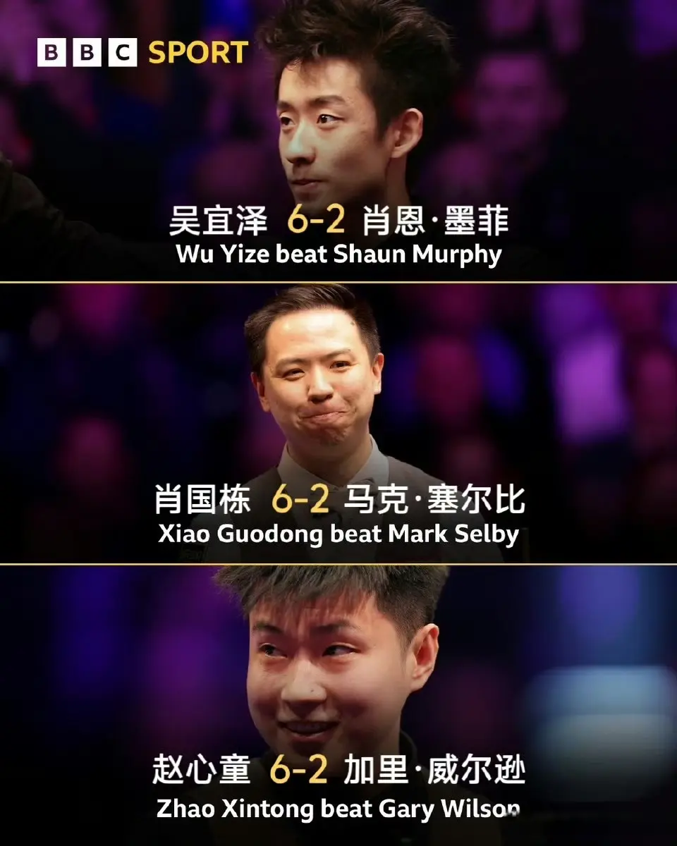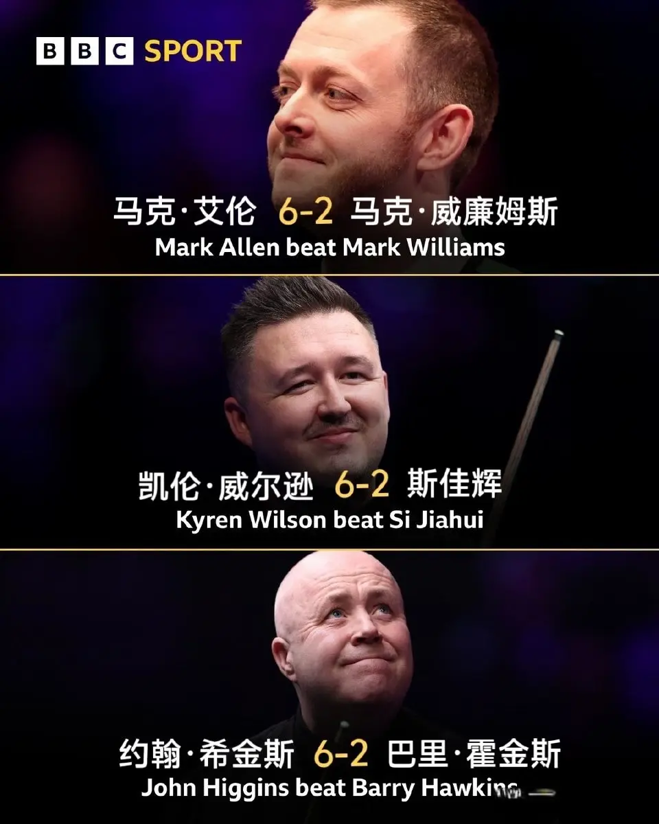 最终吴宜泽、肖国栋、马克艾伦、赵心童、凯伦威尔逊和约翰希金斯都以6比2的相同比分淘汰对手率先晋级8强。