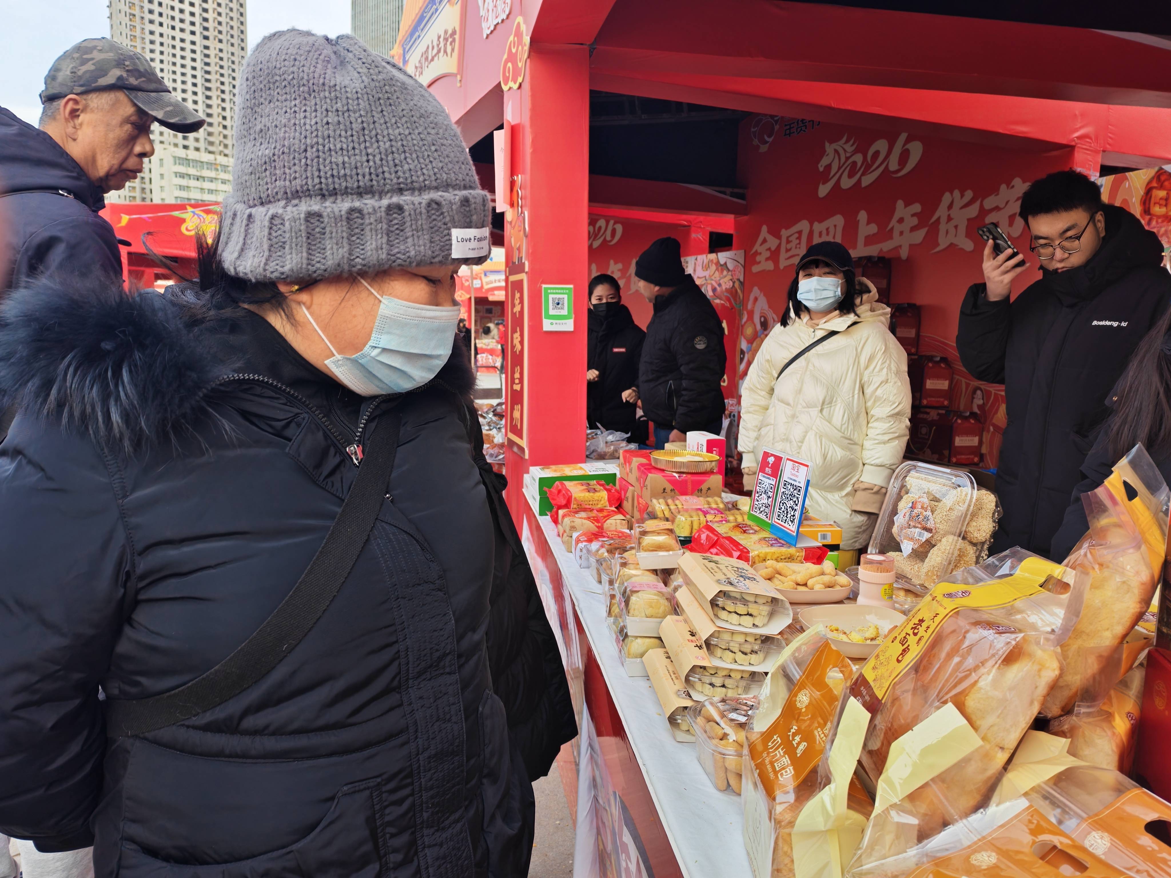 这里正在举办“2026全国网上年货节”,此次年货节于1月19日在兰州市启动。城关区商务局便民商贸服务中心副主任刘建军介绍,作为当地年货主市集之一的东方红广场占地约8000平方米,展位分为家电家政、文创和年俗好物、进出口商品、年菜等10大板块。当地以“线上赋能+线下联动”模式搭建消费平台,130多个展位的商品既能现场购买,也能线上下单,不远处还有专门的网络达人带货专区在线上销售年货。